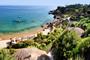 Er is niet echt een strand maar een platform aan zee met ligbedden en parasols