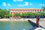 Direct voor het hotel ligt een zonneterras in het water met ligbedden en parasols